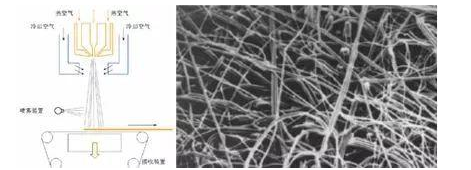 Melt-blown non-woven process: polymer feeding - melt extrusion - fiber formation - cooling - into a network - reinforcement into cloth.