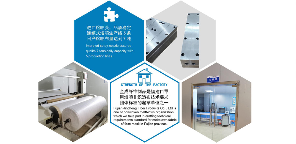 Fujian JinCheng Fiber Products Co., Ltd was established in 2019,put into operation and expansion on the basis of the head office Huizhou Jin Hao Chengcompany,located in Long yan City,Fujian Province,In early 2020, due to the sudden outbreak of the COVID-19inWuhan,our company quickly invested 5 large-scale melt-blown production lines in the Fujian factory based on its rich experience and in-depth understanding in the non-woven industry,airfilter materials and medical health fields,as well as the advantages of amature and professional technical team.